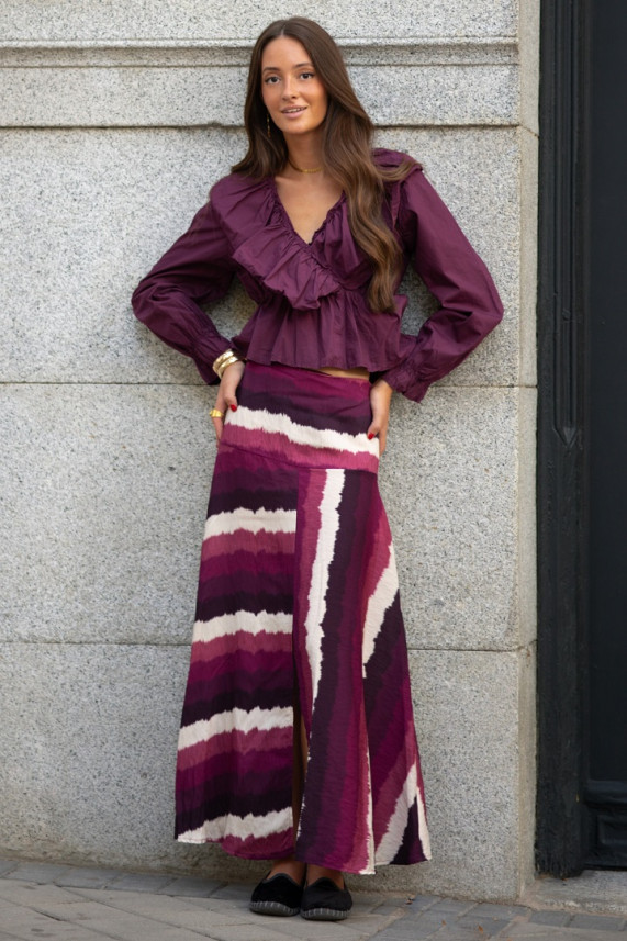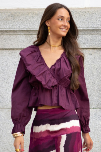 Blusa de escote pico adornado con un gran volante. Manga larga ligeramente abullonada, con puño fruncido. Corte fluido con ligero fruncido bajo el pecho. Perfecta para combinar con faldas o pantalones de tiro alto.