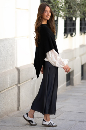 Poncho con corte asimétrico en pico, que aporta dinamismo y movimiento. Prenda ideal para elevar cualquier look.