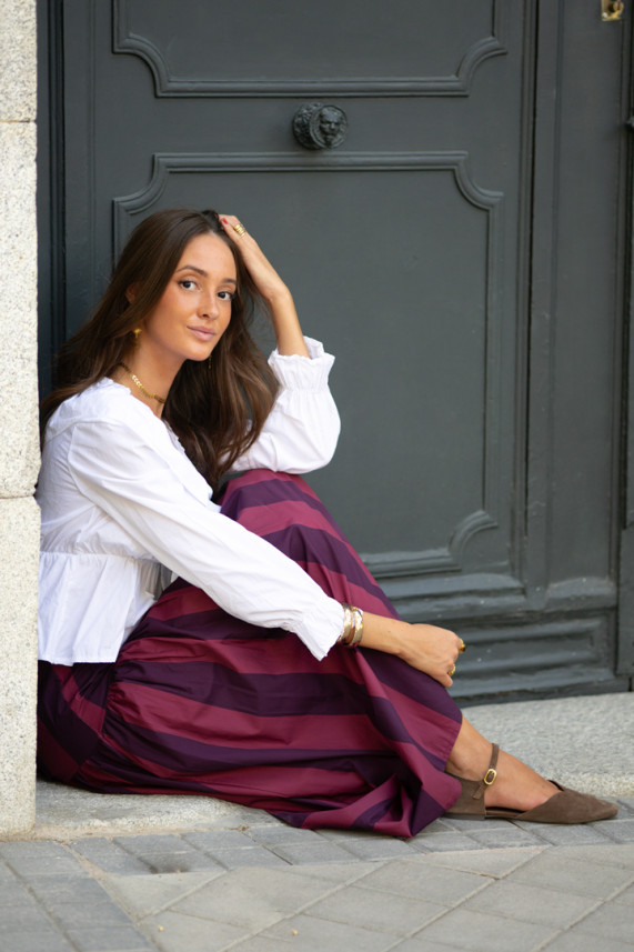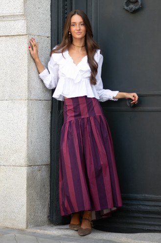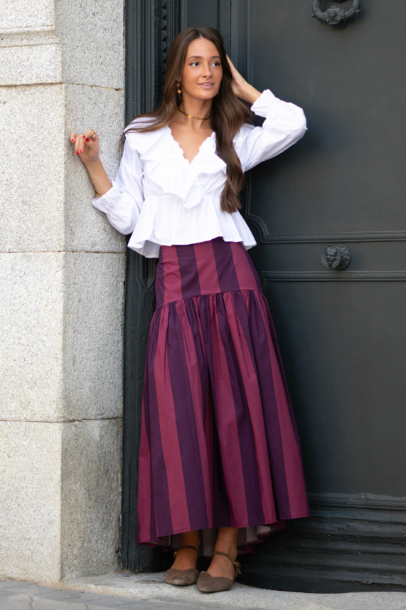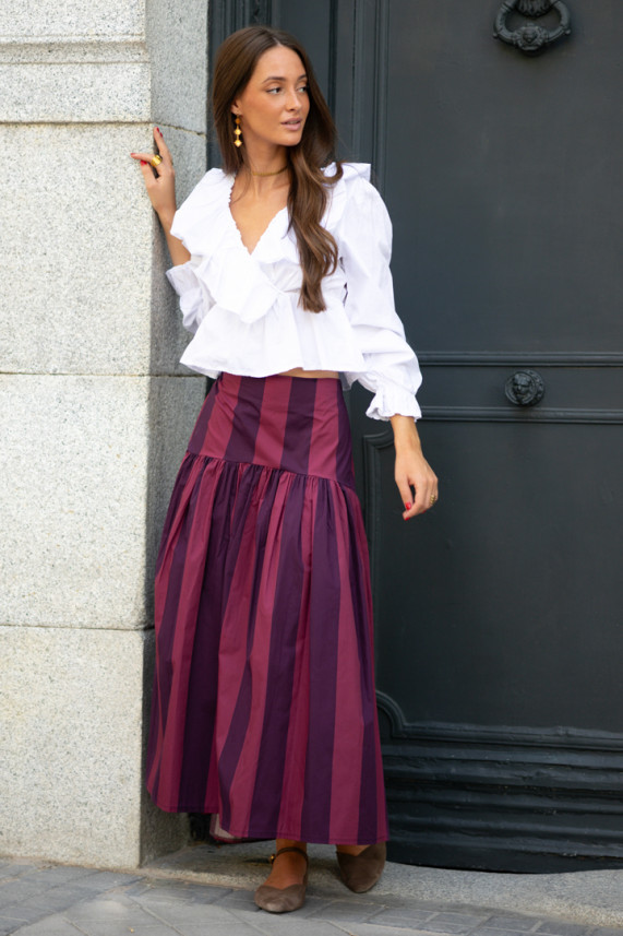 Falda de corte largo y vuelo que aporta movimiento. Diseño de talle alto con efecto fruncido desde la cadera. Confeccionada en tejido ligero de rayas verticales.