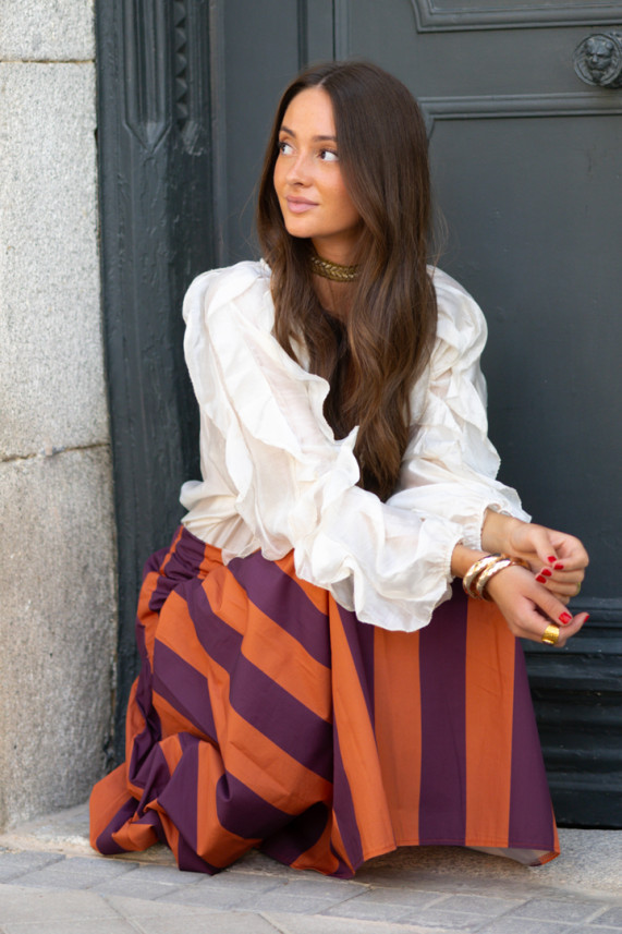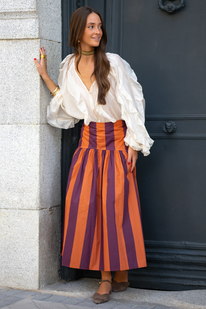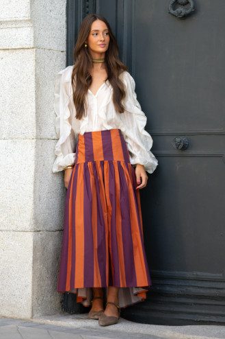 Falda de corte largo y vuelo que aporta movimiento. Diseño de talle alto con efecto fruncido desde la cadera. Confeccionada en tejido ligero de rayas verticales.