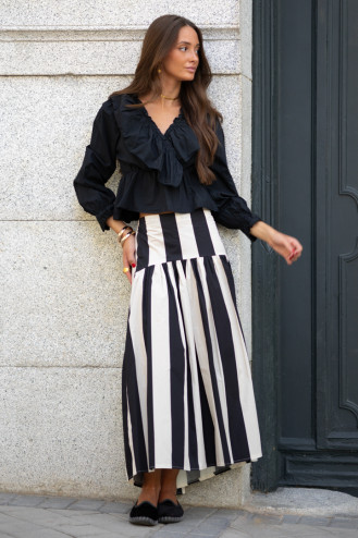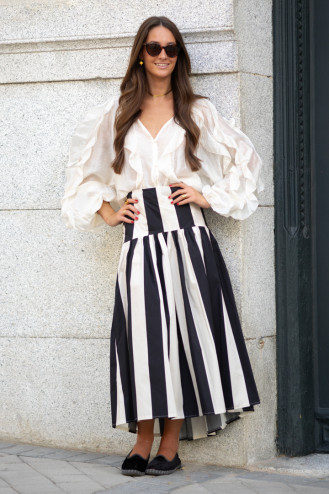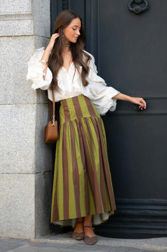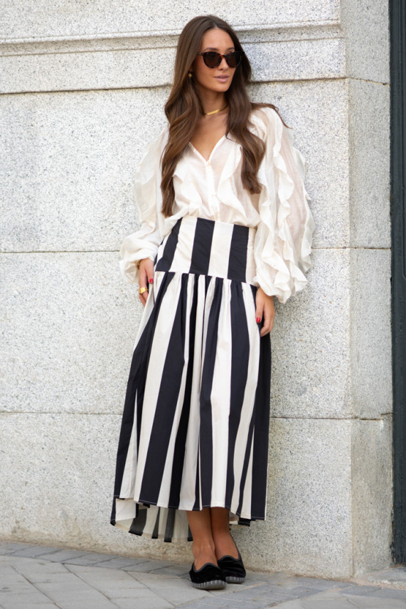Falda de corte largo y vuelo que aporta movimiento. Diseño de talle alto con efecto fruncido desde la cadera. Confeccionada en tejido ligero de rayas verticales.
