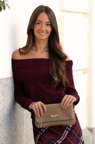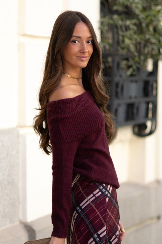 Jersey escote Bardot y manga larga. Efecto dobladillo en el escote. Punto fino. Ideal para combinar con faldas o pantalones de tiro alto.
