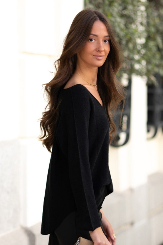Jersey de escote en pico y manga larga. De corte holgado y punto fino. Ideal para días de entretiempo o superponer looks.