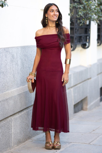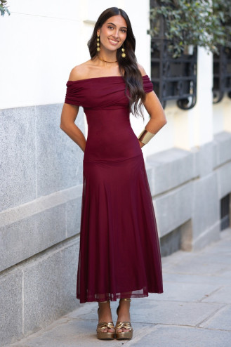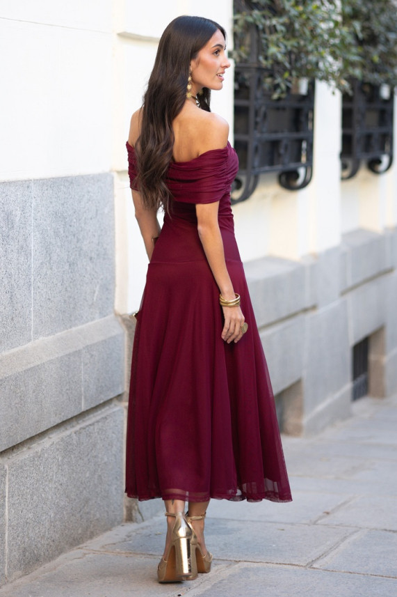 Vestido midi tipo oof-shoulders, con escote recto. Busto drapeado, con falda ligera y vaporosa. Incluye forro interior.