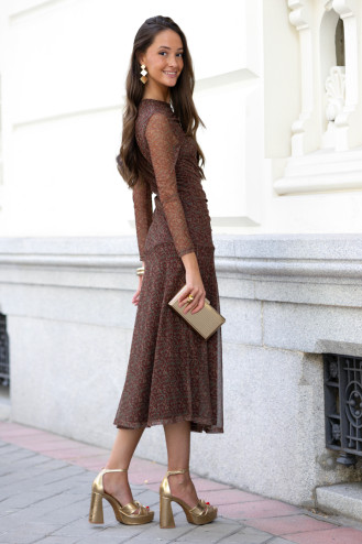 Vestido midi con escote cerrado. Cuerpo fruncido hasta la cadera, y falda con caída fluida. Mangas largas semitransparentes. Cierre en la espalda con abotonadura. Confeccionado en tela con estampado floral y tul. Incluye forro.