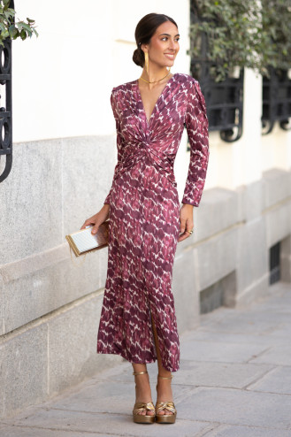 Vestido corte midi con escote en pico y efecto anudado. Manga larga ajustada con falda recta y abertura hacia un lateral para favorecer el movimiento. Confeccionado en estampado geométrico.